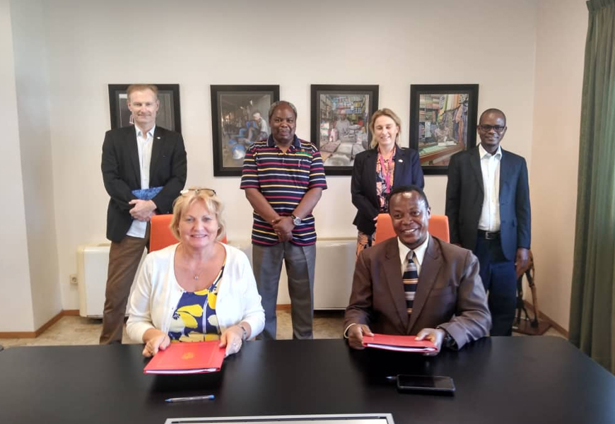 Kaimu Mkurugenzi Mtendaji wa Baraza la Kilimo Tanzania Bw. Timothy Mmbaga ( aliyeketi kulia) akiwa na Balozi wa Norway hapa Nchini Bibi Elizabeth Jacobsen wakiwa kwenye picha ya pamoja muda mfupi baada ya kutia saini ya Mkataba wa makubalino ya ushirikiano kuhusiana na Programu ya Ubia wa Kilimo Tanzania